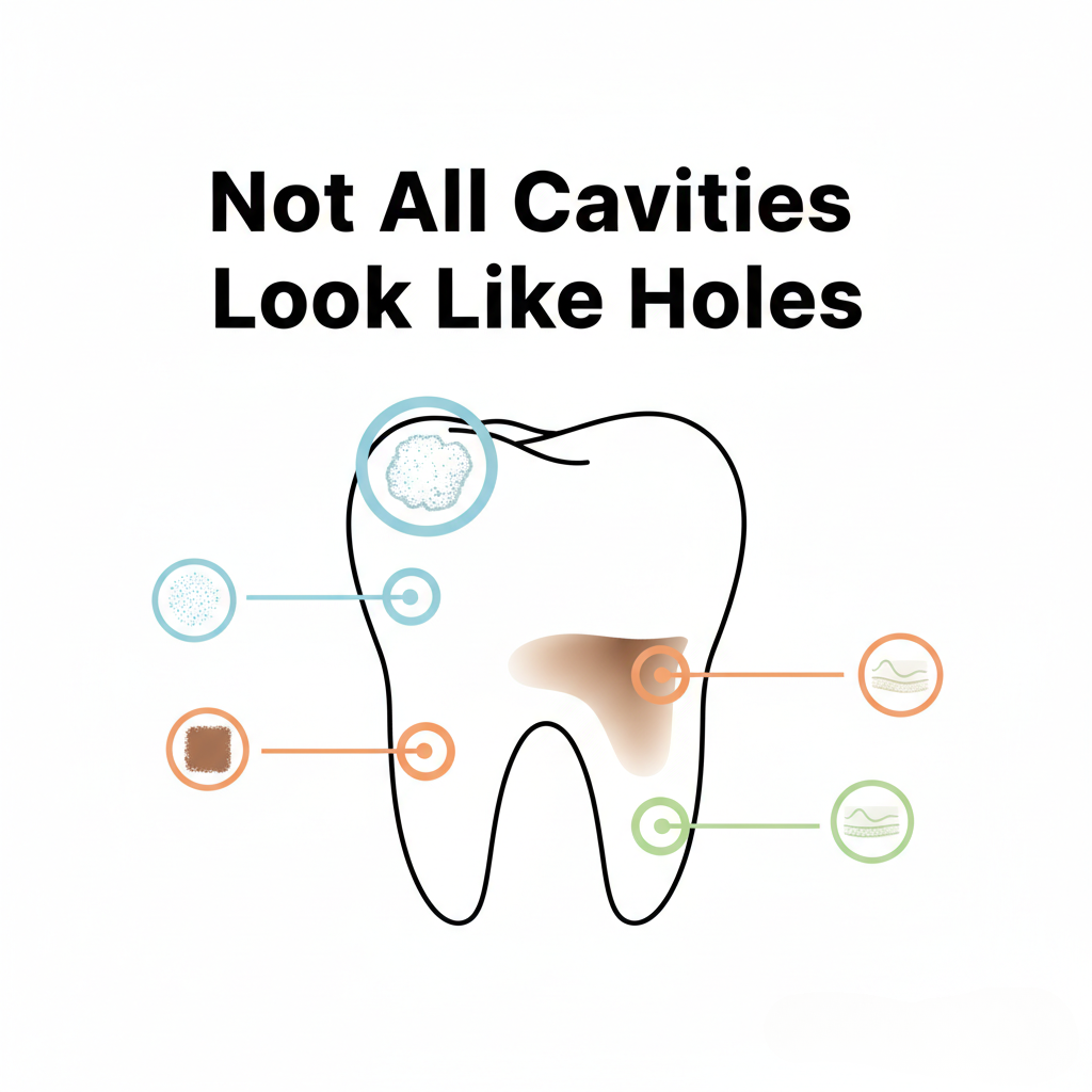 Early cavities often look like dull white or chalky spots on the enamel. They may feel rough before they ever hurt, which is why early exams are so important.