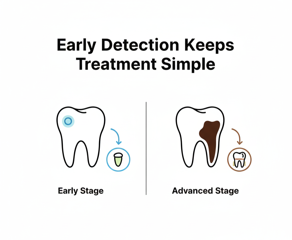 Seeing a cavity doesn’t mean you failed, it just means your tooth is asking for help. Catching it earlier keeps the solution simpler, more affordable, and far less stressful.
